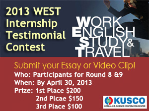 KUSCO is pleased to announce the 2013 WEST Internship Testimonial Contest. For selected testimonial, KUSCO will provide cash rewards. Please click the link below for the detailed information. https://www.kusco.org/kusco-news/413-the-3rd-west-internship-testimonial-contest